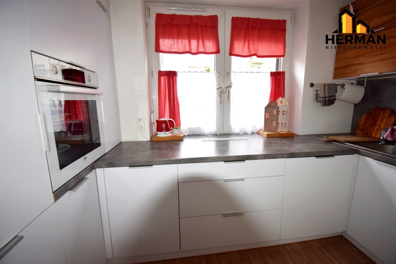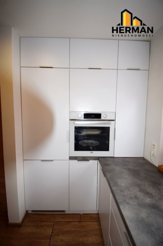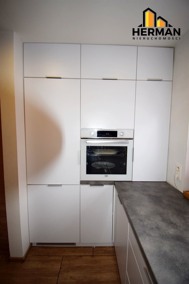 Kuchnia wykonana na wymiar w zabudowie, jasna z oknem, Na wyposażeniu pozostaje: lodówka, płyta gazowa Amika, piekarnik, kuchenka mikrofalowa, zmywarka - część sprzętów na gwarancji producenta. W całym mieszkaniu w oknach zamontowano nowe rolety zewnętrzne koloru antracyt i wewnętrzne.