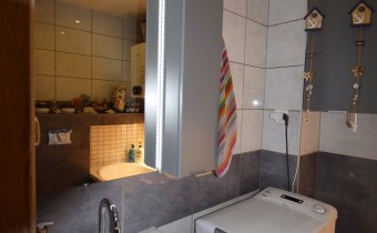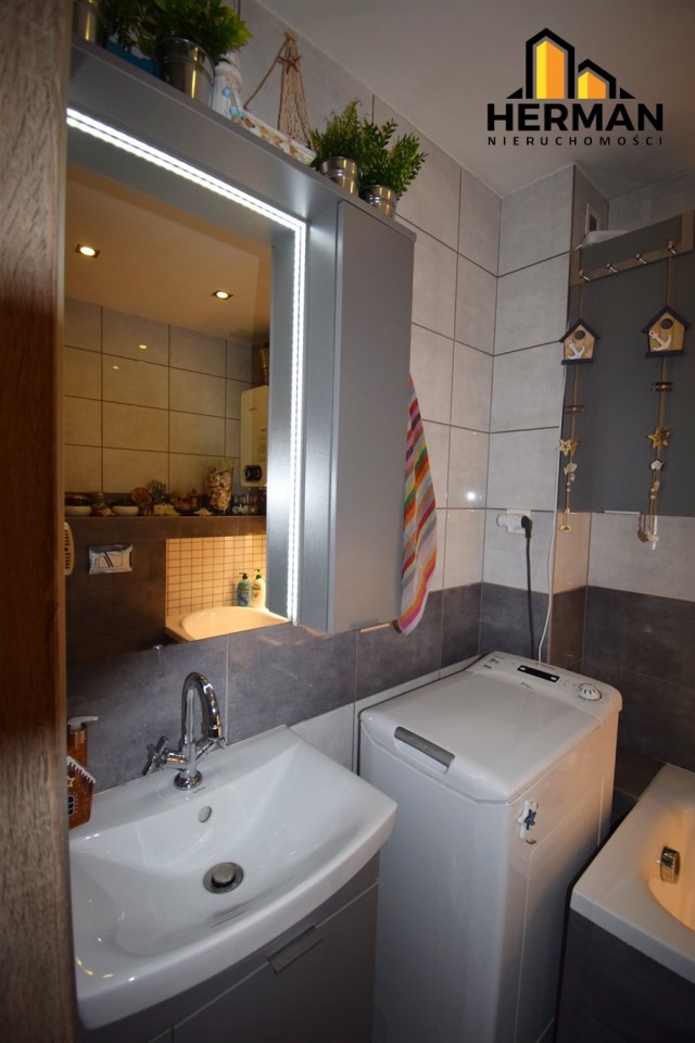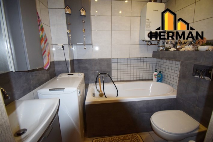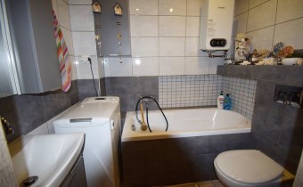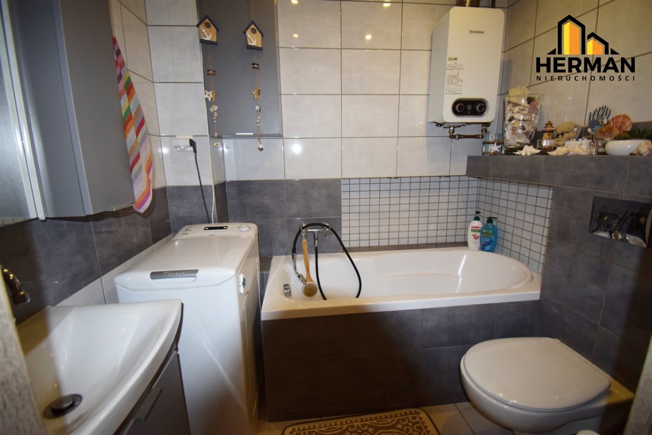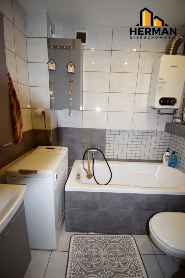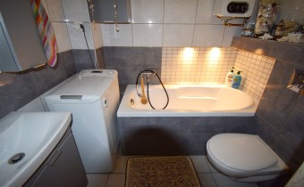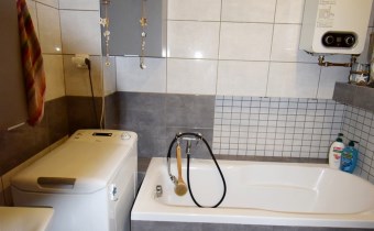 W łazience zabudowano wannę, zestaw podtynkowy WC, zamontowano nowy piec gazowy firmy Junkers, nowy czujnik czadu. Ogrzewanie podłogowe, lustro i wokół wanny zamontowano dodatkowe oświetlenie Led. Na ścianach ułożono płytki ścienne. W łazience zostaje pralka automatyczna.